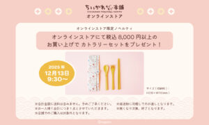 2025年12月13日(土)9:30受注分より、 ちいかわもぐもぐ本舗 オンラインショップにて 商品を税込8,000円以上お買い上げのお客様にノベルティをプレゼント! ※合計金額に送料は含みません。予めご了承ください。 ※発送物に同梱してのお渡しとなります。 ※お一人様1会計につき1点とさせていただきます。 ※無くなり次第終了となります。 ※店舗(京都伏見店・川越店)でのご購入は対象外となります。